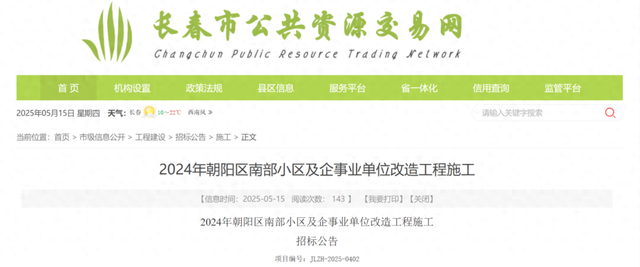 5月15日,长春市公共资源交易网发布《2024年朝阳区南部小区及企事业单位改造工程施工》招标公告,重点内容如下:
