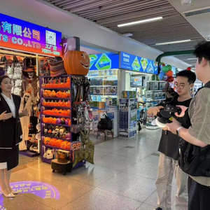 这是义乌商贸城集团的工作人员在为她拍摄招商视频素材。若是放在往年,她不会有这么多时间拍视频还反复NG——每年四月是聂自勤最忙碌的季节,一茬茬不同肤色的客户排着队挤进这个不到10平方米的店铺,一年的订单就能基本敲定,随后是生产和发货。一两个月后,他们挑选的万圣节面具被装进货运巨轮的集装箱里,漂洋过海抵达另一个国度。