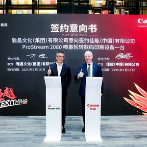 2025年5月15日,佳能(中国)有限公司与雅昌文化集团(以下简称“雅昌”)于第十一届北京国际印刷技术展览会(以下简称“CHINA PRINT 2025”)首日,举办“‘数’造未来智印商机”佳能※1与雅昌签约仪式暨商业数码印刷创新应用高峰论坛。签约仪式上,雅昌宣布订购佳能ProStream 2000系列数码喷墨打印机,这是佳能引入中国市场的首台ProStream 2000系列数码喷墨打印机,标志着“印刷+艺术”跨界融合生产解决方案的全面升级,为艺术品商业印刷的数字化转型树立了新的典范。