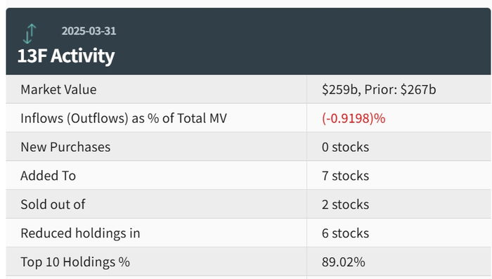 同时,伯克希尔在第一季度也没有新建仓任何股票,仅小幅加仓7只股票、减仓6只股票,清仓2只股票,其持仓市值从前一季度的2670亿美元小幅减少至2590亿美元。