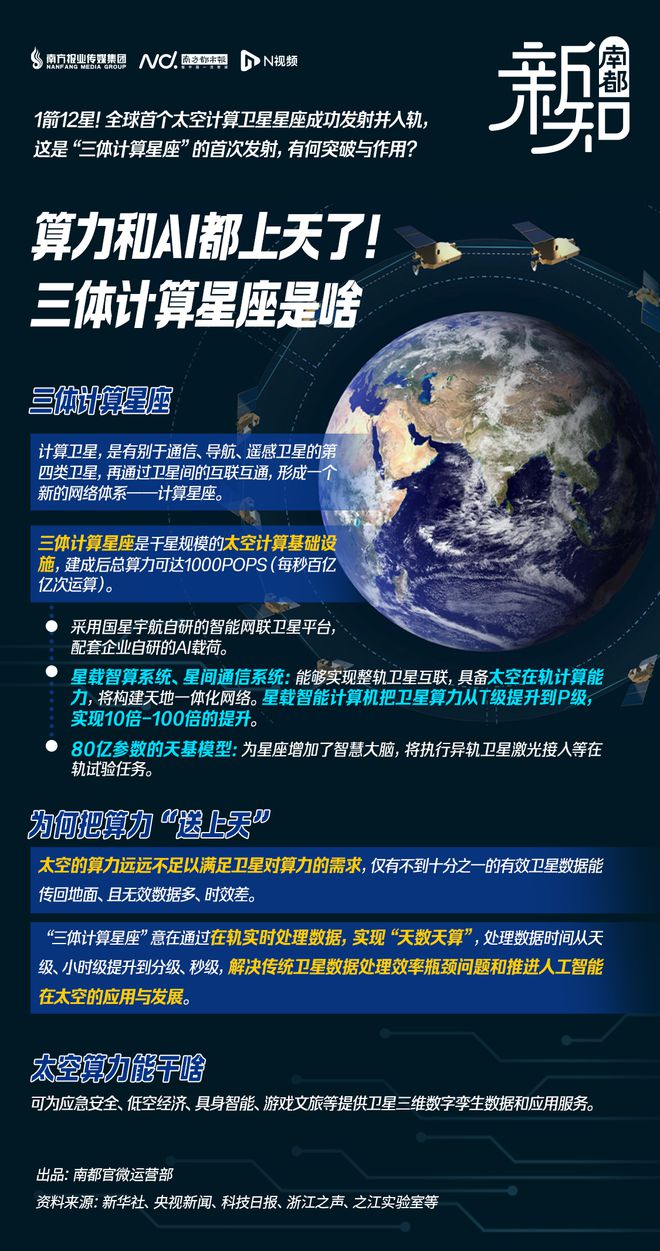 “三体计算星座”将通过在轨实时处理数据,处理数据时间将从天级、小时级提升到分级、秒级,解决传统卫星数据处理效率瓶颈问题,实现“天数天算”甚至“地数天算”,推动人工智能在太空的应用与发展。