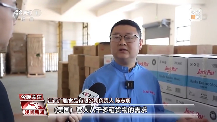 江西广雅食品有限公司负责人 陈志翔:目前没办法满足美国客人八千多箱的需求,所以我们紧急增加了另外一条生产线。缺货一个多月,美国客人非常难以找到像我们中国这么质优价廉的竹笋产品。