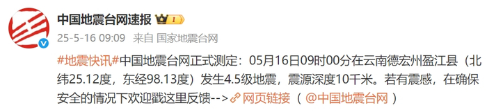 中国地震台网正式测定:05月16日09时00分在云南德宏州盈江县(北纬25.12度,东经98.13度)发生4.5级地震,震源深度10千米。