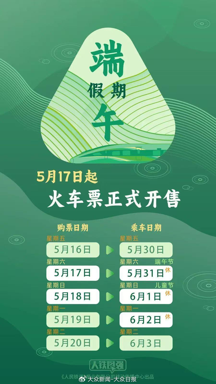 5月16日,端午假期前一天(5月30日)的火车票正式发售。2025年端午小长假自5月31日至6月2日,共3天。根据目前铁路客票提前15天预售的规则类推,5月17日开售5月31日假期首日火车票;5月19日开售6月2日假期最后一天火车票。