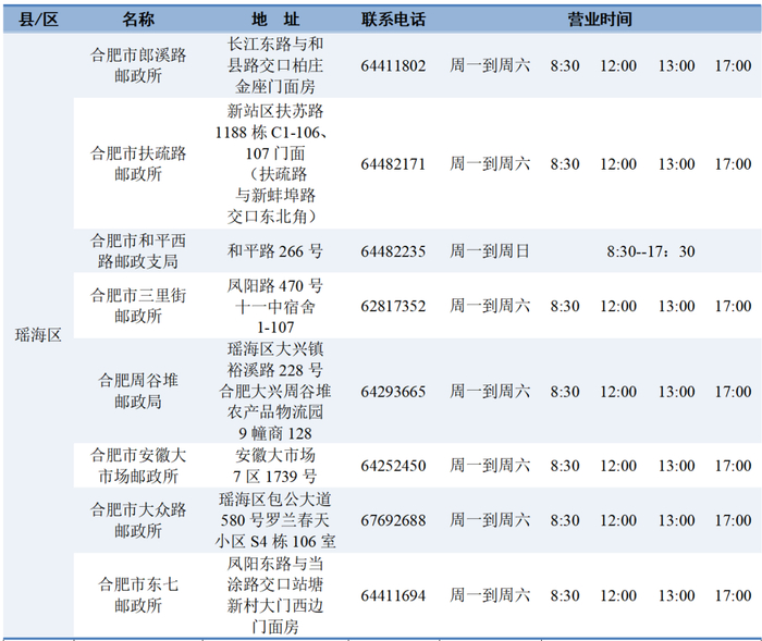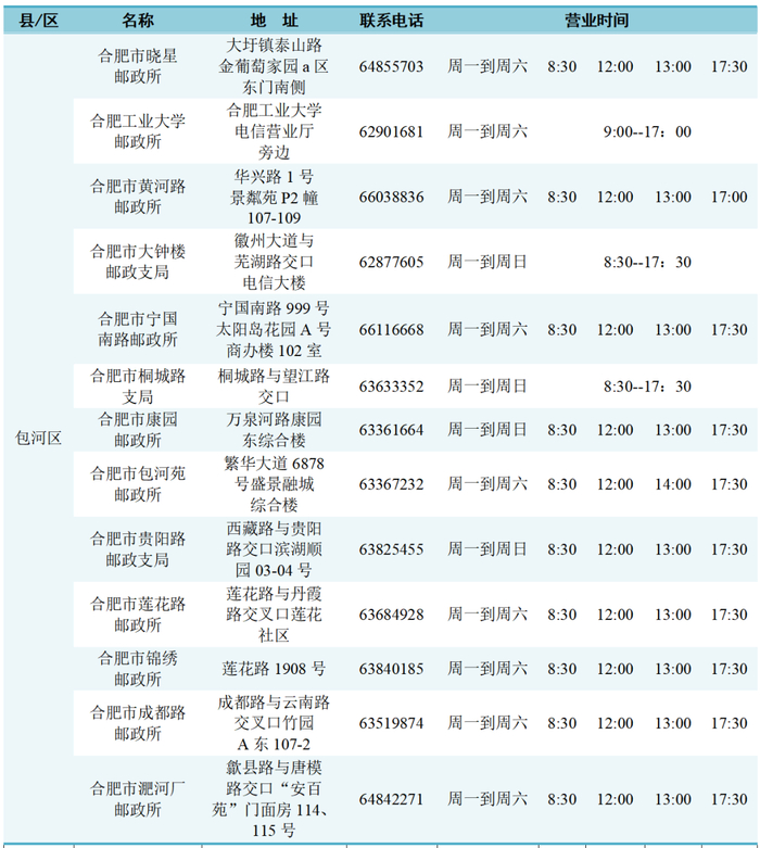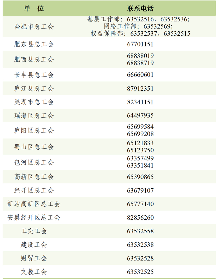 (五)合肥市总工会以及所属县(市)区、开发区总工会、产业工会咨询电话见下方表格,工作时间为:工作日上午8:00-11:30,下午14:30-17:30;