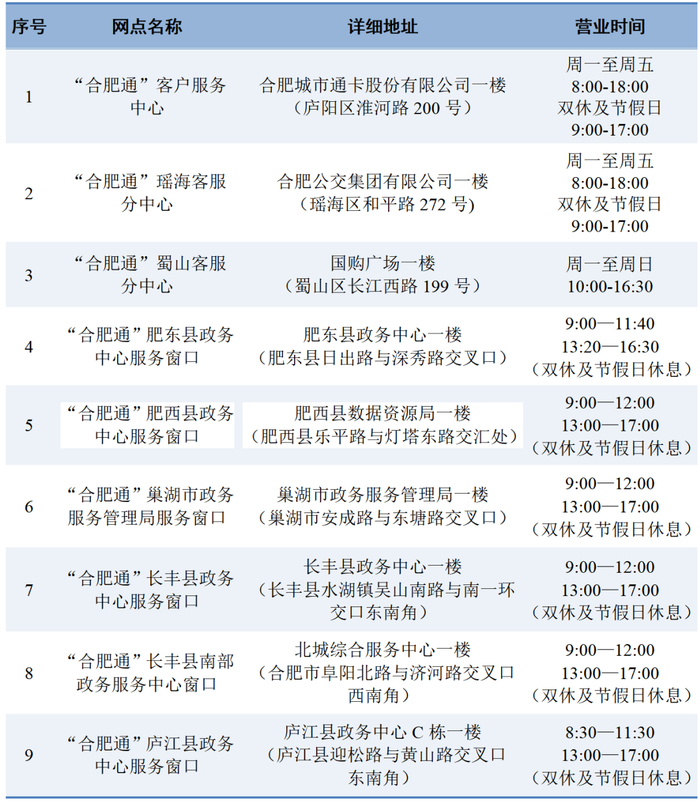 (六)如对“合肥通”卡的业务办理有疑问,可拨打合肥城市通卡股份有限公司客服电话:62851595,工作时间为:上午8:00至下午17:30,节假日不休息。