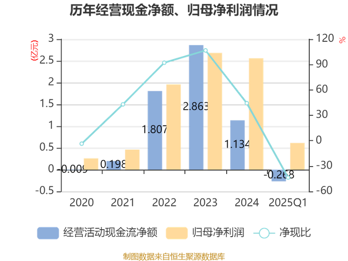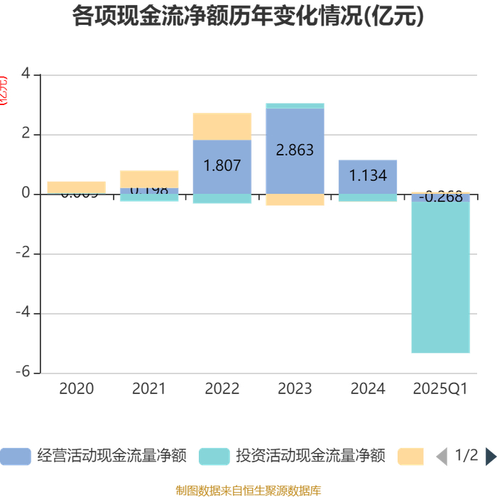 截至2025年一季度末,公司经营活动现金流净额为-2679.14万元,同比减少5170.51万元;筹资活动现金流净额563.76万元,同比增加938.87万元;投资活动现金流净额-5.07亿元,上年同期为-2.53亿元。