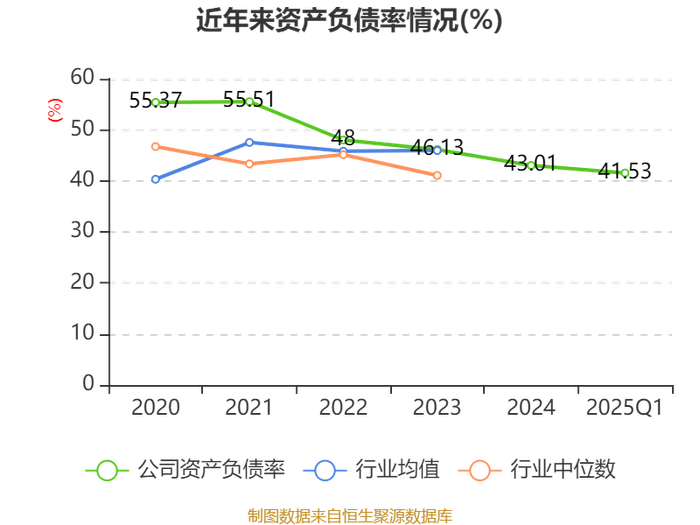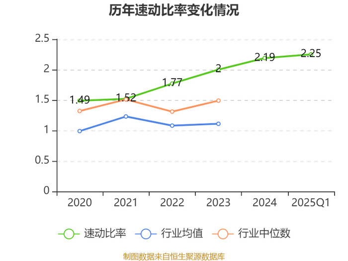 2024年,公司流动比率为2.49,速动比率为2.19。2025年第一季度,公司流动比率为2.59,速动比率为2.25。