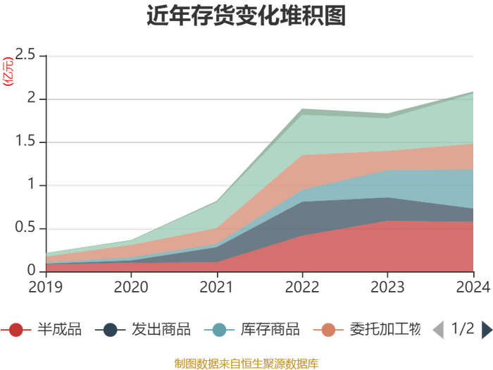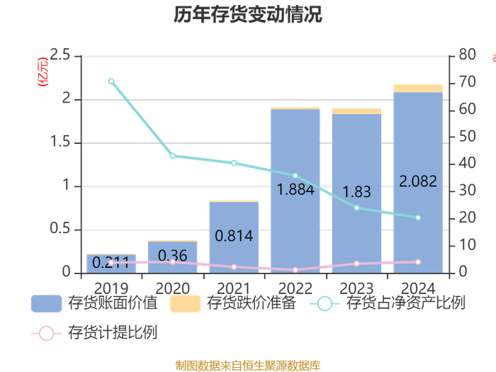 从存货变动来看,截至2024年末,公司存货账面价值为2.08亿元,占净资产的20.33%,较上年末增加2525.45万元。其中,存货跌价准备为871.5万元,计提比例为4.02%。