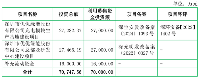 据招股书,“深圳市优优绿能股份有限公司充电模块生产基地建设项目”拟建设具有一定产能规模、自动化水平较高的全流程生产线,以提升公司形象,扩大生产能力,分散外协生产风险,满足客户及下游市场快速增长的订单需求,为公司未来业绩增长提供有力的产能支撑。“深圳市优优绿能股份有限公司总部及研发中心建设项目”拟购置自有场地用于公司总部及研发中心建设,在解决现有办公场地不足问题的同时,引进先进的研发设备,建设更为先进的EMC电磁兼容实验室等高规格研发实验室,全方位提升公司的整体研发实力。“补充流动资金”拟满足公司战略发展和生产经营的资金需求,有利于增强公司资本实力,提升整体经营绩效,提高公司抵御风险的能力。