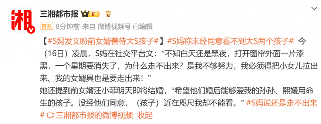 5月16日,据报道,徐熙媛(大S)的妈妈凌晨在社交平台文:“不知白天还是黑夜,打开窗帘外面一片漆黑,一个星期要消失了,为什么走不出来?是我不够努力,我必须得把小女儿拉出来、我的女婿具也是要走出来!”