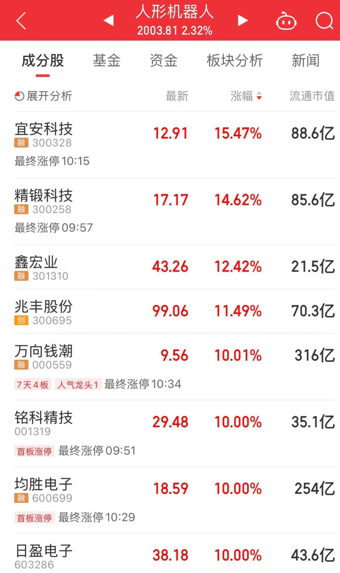 今天上午,人形机器人板块大涨,宜安科技、精锻科技等个股大涨。