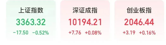 截至上午收盘,上证指数下跌0.52%,深证成指上涨0.08%,创业板指上涨0.16%。