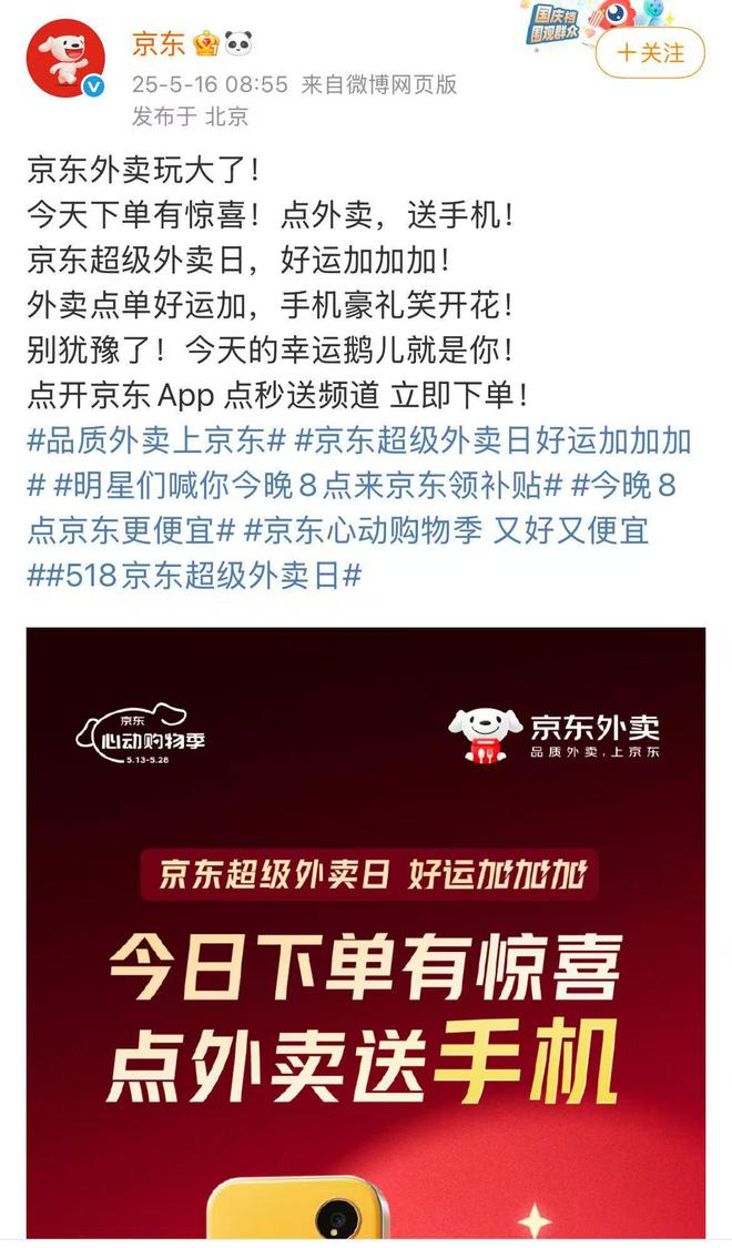 今日,京东官方发文“今天下单有惊喜!点外卖,送手机”。