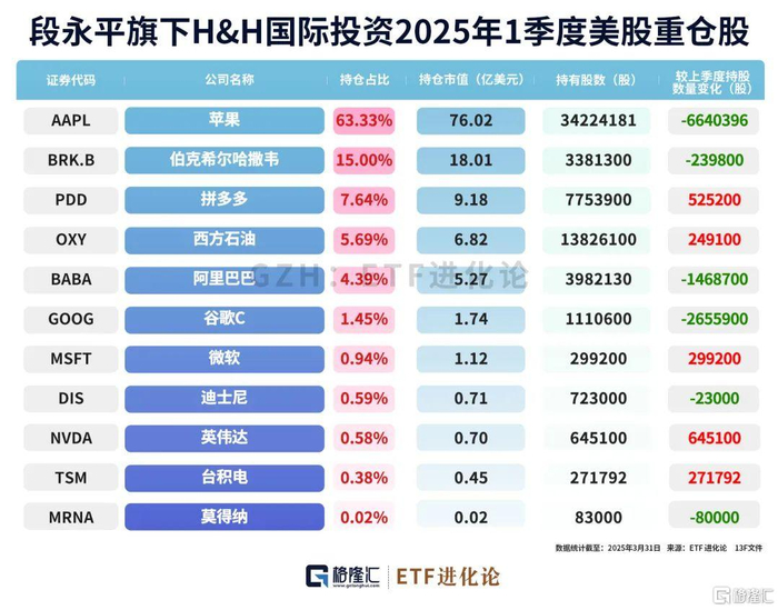 截至2025年一季度末,段永平管理的H&H持仓股包括苹果、伯克希尔B、拼多多、西方石油、阿里巴巴、谷歌C、微软、迪士尼、英伟达、台积电和莫德纳。