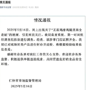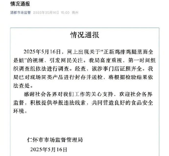 2025年5月16日,网上出现关于“正新鸡排鸡腿里面全是蛆”的视频,引发网民关注。我局高度重视,第一时间组织调查组依法进行调查。经查,该涉事门店证照齐全。我局已对现场同类产品进行封存并送检,将根据检验结果依法查处。