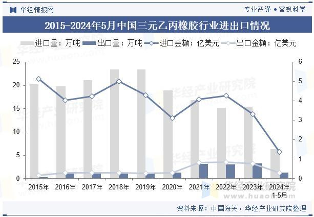 中国三元乙丙橡胶行业在过去几年中逐渐提高了自给率,降低了对进口的依赖,同时在国际市场上增强了竞争力,出口量和出口金额稳步增长。中国三元乙丙橡胶行业在生产能力和市场拓展方面取得了显著进展,逐渐成为全球市场的重要参与者。2024年1-5月中国三元乙丙橡胶进口量为6.38万吨,出口量为1.34万吨,进口金额为1.38亿元,出口量为0.302亿元。