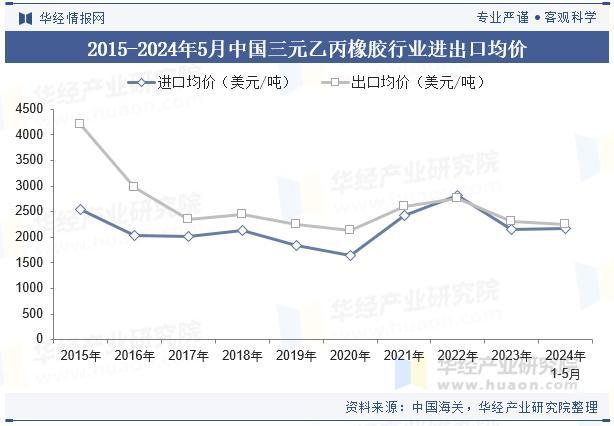 中国三元乙丙橡胶行业进口均价普遍低于出口均价,这表明中国在三元乙丙橡胶的进口中,可能更多依赖于价格较低的原材料或初级产品,而出口则多为附加值较高的成品或半成品。出口均价的波动和相对较高的均价反映了中国三元乙丙橡胶产品在国际市场上的竞争力,通过提高产品质量和附加值,保持了较高的出口价格。