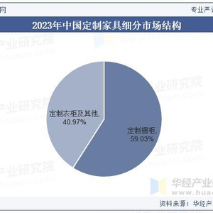 凭借兼顾实用性和空间利用率,又充分满足消费者个性化需求等优势,我国定制家具产业规模不断扩大。从细分市场来看,2023年我国定制橱柜市场规模约为1277.2亿元,占定制家具市场总规模比重的59.03%,定制衣柜及其他规模占比40.97%。