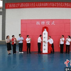 中新网广西新闻5月16日电 (梁卡珊)近日,广西开放大学与都安瑶族自治县人民政府战略合作协议签约暨都安开放大学揭牌仪式,在都安职教中心举行。