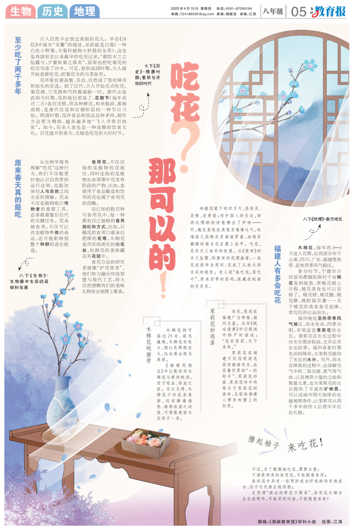 4月10日5版“撸起袖子来吃花”开启了一场独特的跨学科之旅。花儿不仅是美景,还能成为餐桌上的美食。从枝头到舌尖,这里面涉及植物学、营养学等多学科知识。怎样健康地吃花?在探索的过程中,同学们能了解各种花的营养价值,以及烹饪过程中的科学原理,感受跨学科知识的魅力。