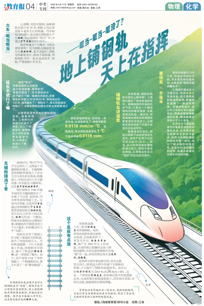 4月17日4版“哐当,你去哪了呢”以生活中常见的现象为依托融入跨学科知识。文中以高铁“静音”这一现象为线索,介绍无缝钢轨焊接工艺与锁定轨温技术,涉及物理学科中的热胀冷缩原理和工程技术知识;同时讲解铝热反应化学原理在焊接中的应用,将物理和化学知识结合起来,让读者更易理解复杂的科技知识,体会到学科知识与实际生活中的紧密联系。