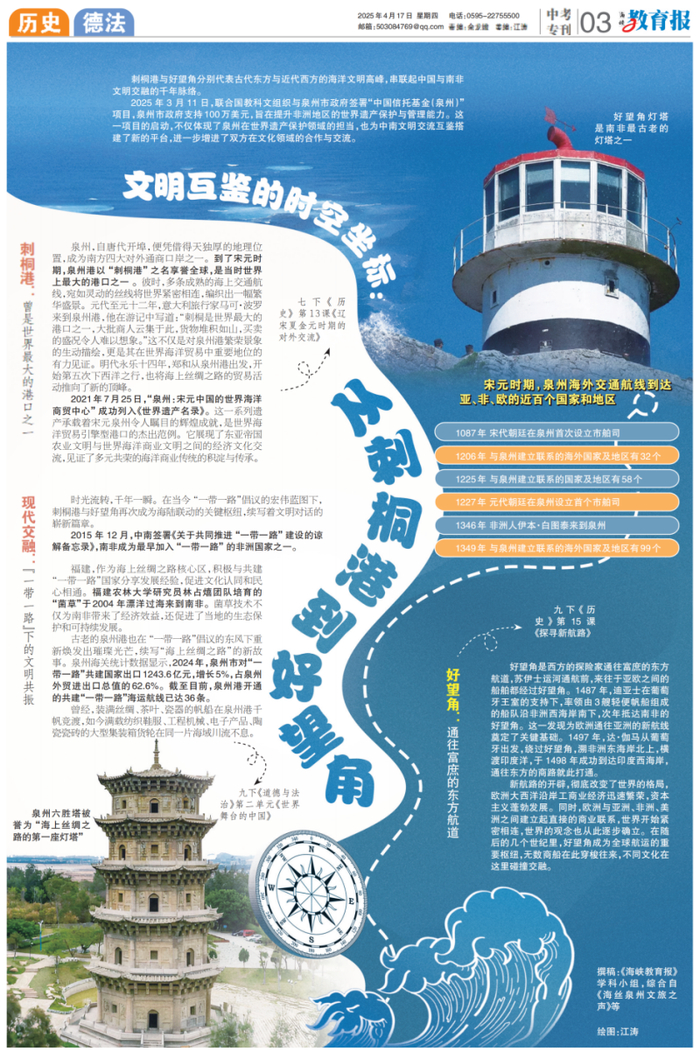 4月17日3版“从刺桐港到好望角”以泉州港为切入点,回溯其作为宋元福建海洋商贸中心的辉煌,涉及历史学科中古代港口贸易的发展历程;展望“一带一路”倡议的新使命,关联道德与法治学科里的国际合作与发展战略;提及菌草技术国际合作案例,又融入生物学科中菌草的知识以及地理学科中不同地区的环境与资源差异。本版把历史、道德与法治、地理、生物知识巧妙串联,涉及的知识点这么多,这样跨学科的内容,能帮你把碎片化知识整合起来,构建完整的知识体系,中考答题的时候思路更清晰,分数自然就高啦!