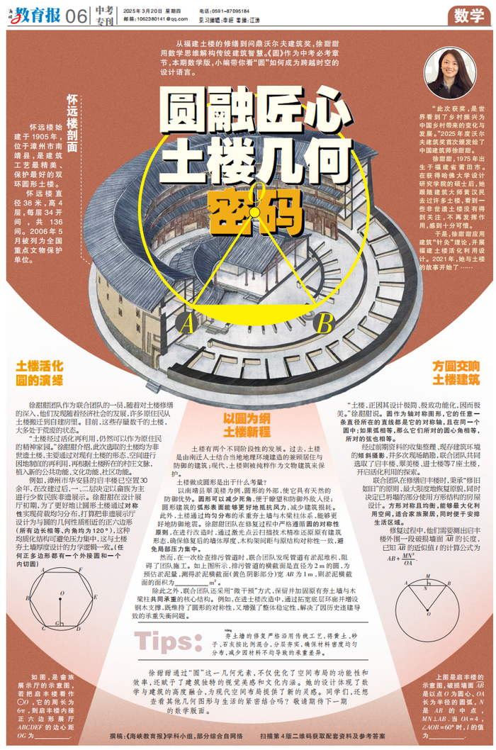 3月20日6版“圆融匠心,土楼几何密码”告诉我们,从福建土楼的修缮到问鼎沃尔夫建筑奖,中国建筑师徐甜甜用数学思维解构传统建筑智慧。圆形土楼暗藏几何玄机,从夯土配比这种涉及物理、化学学科知识的建筑材料问题,到运用激光扫描修复土楼所关联的现代科技,再到土楼圆形结构中的几何原理,如圆形的周长、面积在建筑设计中的应用等,都是跨学科的考点。在中考中,数学学科可能考查土楼建筑中圆形相关的几何计算;物理学科可考查夯土材料的力学性质;语文则能以土楼为主题,考查对传统文化建筑的理解与赏析。