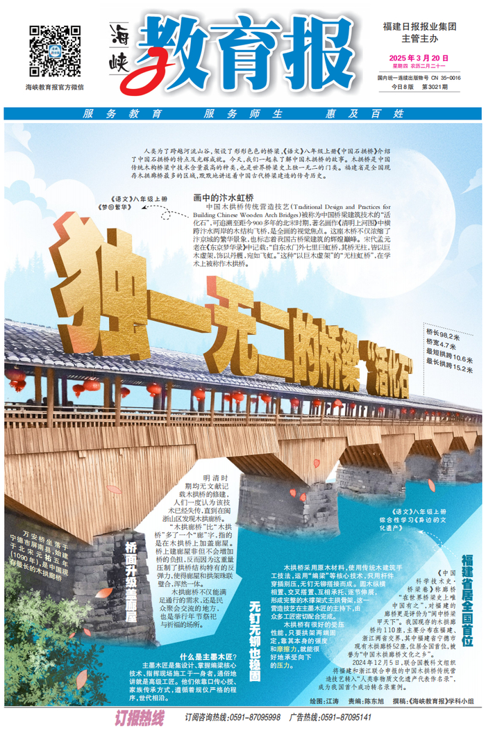3月20日1版“独一无二的桥梁活化石”介绍了福建省是全国现存木拱廊桥最多的区域,这些木拱廊桥无钉无铆,却能屹立千年不倒,其中蕴含的中国木拱桥传统营造技艺已入选人类非遗名录。从桥梁的结构设计,到榫卯技艺的精妙运用,无不展现着古人的智慧。在中考中,这一知识点可能会涉及物理学科中力学原理的考查,如桥梁结构如何分散受力以保持稳固;也可能在语文作文中作为传统文化传承的素材,让考生阐述对传统技艺的理解与感悟;甚至在历史学科里,考查古代建筑技艺的发展脉络。