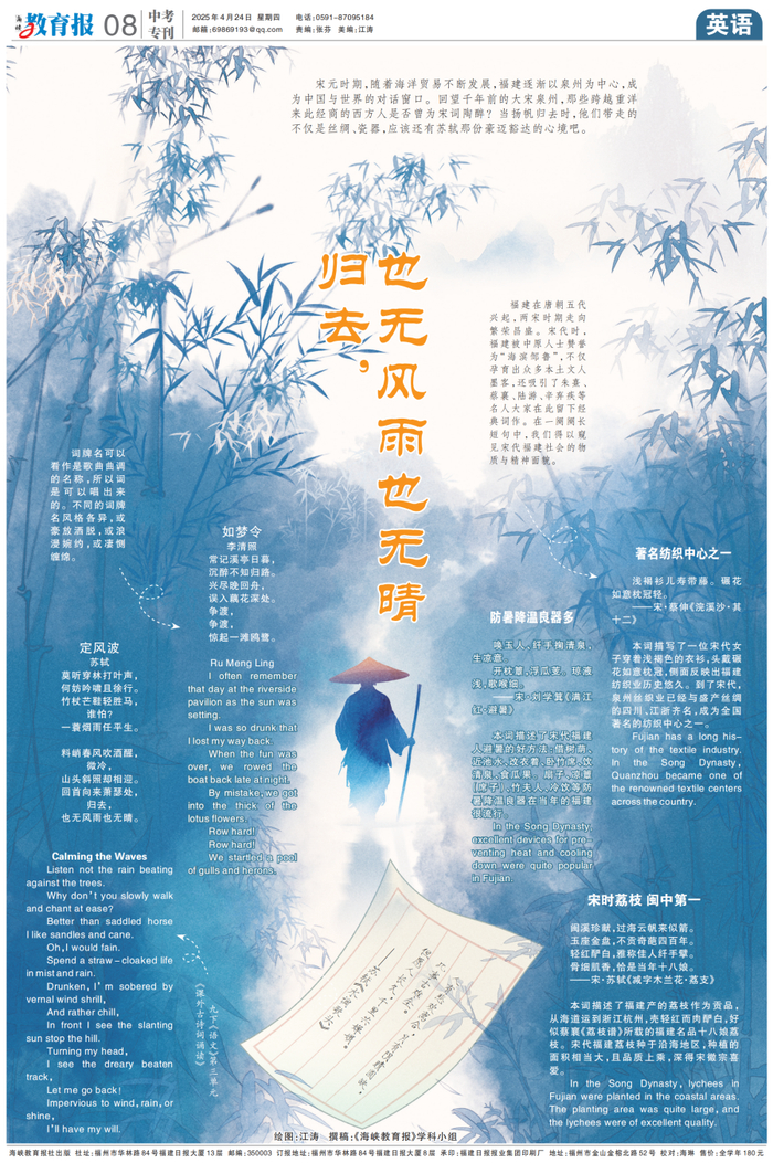 4月24日8版“归去,也无风雨欲无晴”一文,用英语介绍了宋元时期名人大家在福建留下的经典词作,既学习到英语诗作的表达,又了解了语文中的词牌名,并窥见了宋代福建社会的物质与精神面貌,融合了历史,横跨了英语、语文、历史三个学科。