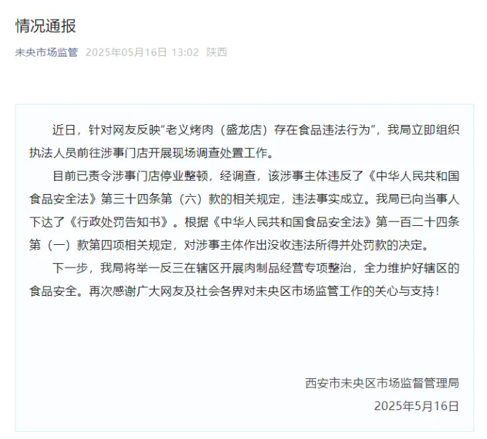 红星新闻记者了解到,涉事烤肉店所在辖区的未央区市场监督管理局张家堡市场监管所已针对此事立案调查,老义烤肉(盛龙广场)被责令停业整顿。