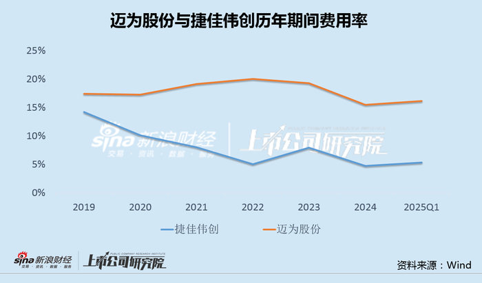净利率的显著差异来源于控费能力的不同。数据显示,自2019年以来,捷佳伟创销售、管理、财务和研发等期间费用率不断走低,而迈为股份却基本走平,两者差距日益显著。