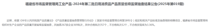 福建公布2024年第二批日用消费品产品质量省级监督抽查结果(婴幼儿奶瓶)