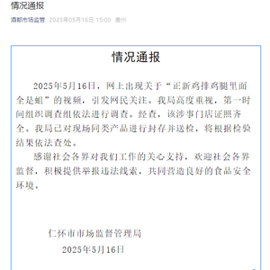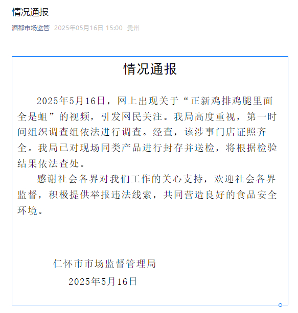 2025年5月16日,网上出现关于“正新鸡排鸡腿里面全是蛆”的视频,引发网民关注。我局高度重视,第一时间组织调查组依法进行调查。经查,该涉事门店证照齐全。我局已对现场同类产品进行封存并送检,将根据检验结果依法查处。