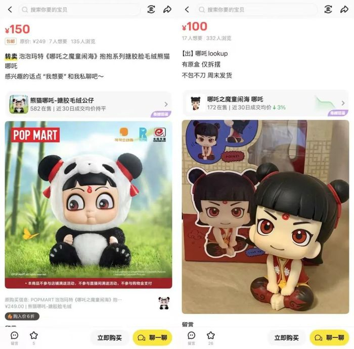 在闲鱼平台,目前只有官宣联名较早、市面流通量有限的周边相对保值,除了高位卡牌、隐藏款盲盒这种显而易见的高价品之外,譬如万代出品的坐姿哪吒、敖丙大号玩偶,除现货少量溢价外,预售转单价格也基本能够拉到原价。