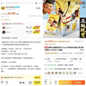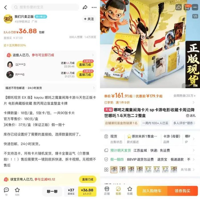 商品“哪吒之魔童闹海卡游斗天包第一弹”,电商平台上的原定价为180元一盒90张,而闲鱼上一家被买家普遍评价为正版的商家售出全新未拆整盒定价仅37元,折扣接近2折。拼多多上的许多卖家定价则达到45元左右,定价稍高,但也是标价的零头。