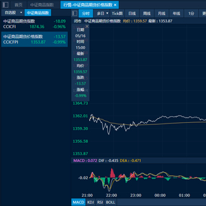 截至16日下午收盘,中证商品期货价格指数收报1353.87点,较前一交易日下跌13.57点,跌幅0.99%;中证商品期货指数收报1874.36点,较前一交易日下跌18.09点,跌幅0.96%。