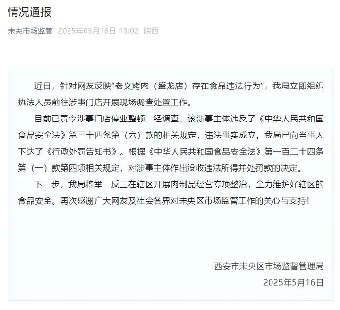 5月16日,西安市未央区市场监督管理局就该事件发布情况通报: