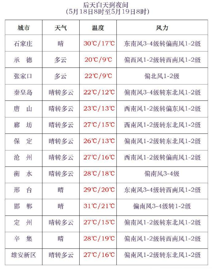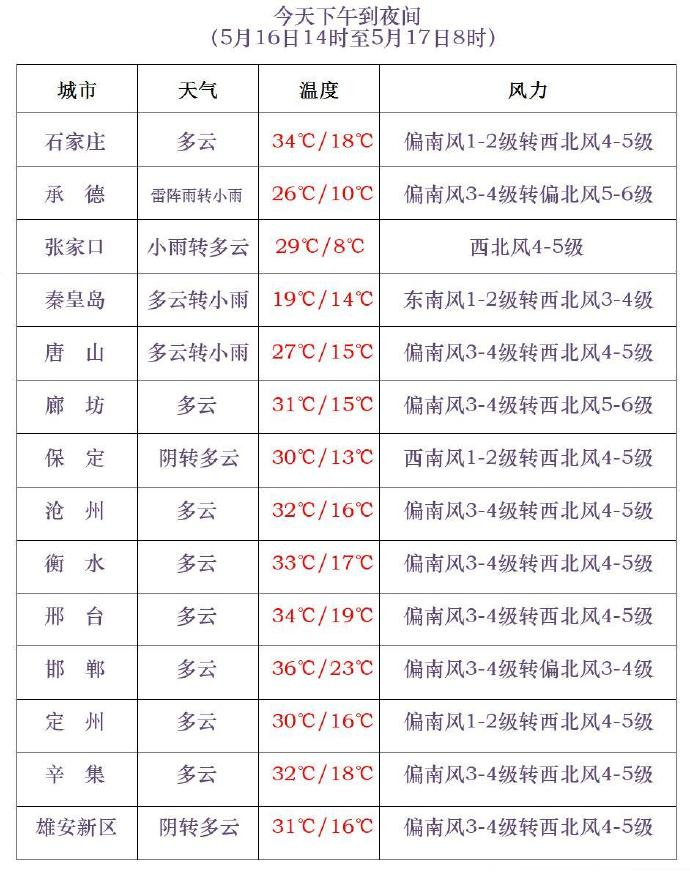 今天下午到夜间,石家庄、衡水以北地区多云转阴有雷阵雨或阵雨,雷雨时局地伴有短时大风、冰雹、短时强降水等强对流天气,其他地区晴转多云。最高气温,张家口北部、承德、唐山、秦皇岛、保定西北部14~29℃,石家庄、邢台、邯郸三个地区的西部35~37℃,其他地区30~34℃。明天早晨,张家口、承德北部最低气温下降4~8℃,其中坝上地区局地下降8~11℃。最低气温,张家口、承德、保定西北部-2~10℃,其他地区11~23℃。