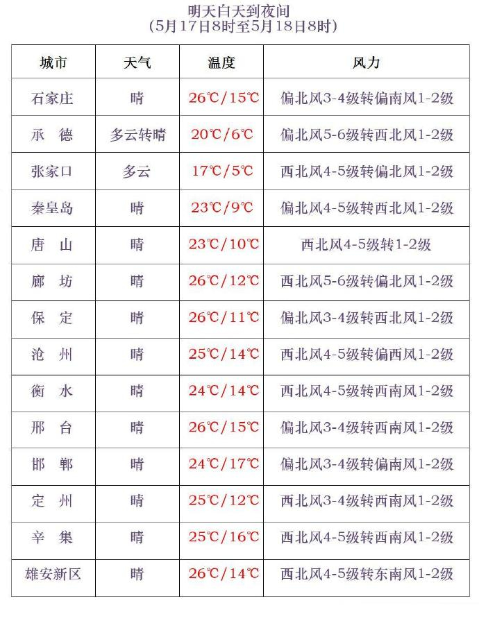 明天白天,张家口北部、承德北部多云转晴,其他地区晴间多云。