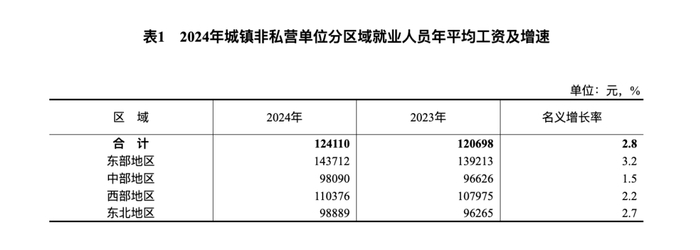 2024年,全国城镇非私营单位就业人员年平均工资124110元,比上年增加3412元,名义增长2.8%,按可比口径增长2.6%。