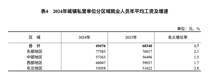 2024年,全国城镇私营单位就业人员年平均工资69476元,比上年增加1136元,名义增长1.7%,按可比口径增长4.0%。