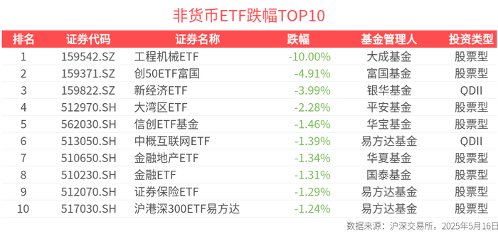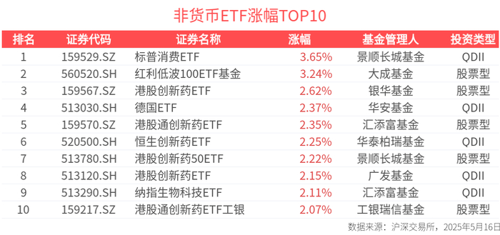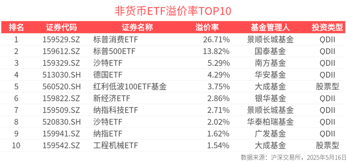 ETF英雄汇(2025年5月16日):标普消费ETF(159529.SZ)领涨、标普500ETF(159612.SZ)溢价明显