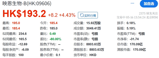 自上市以来,映恩生物股价涨超100%,现报193.2港元/股,较94.6港元/股的发行价翻了一番还多。