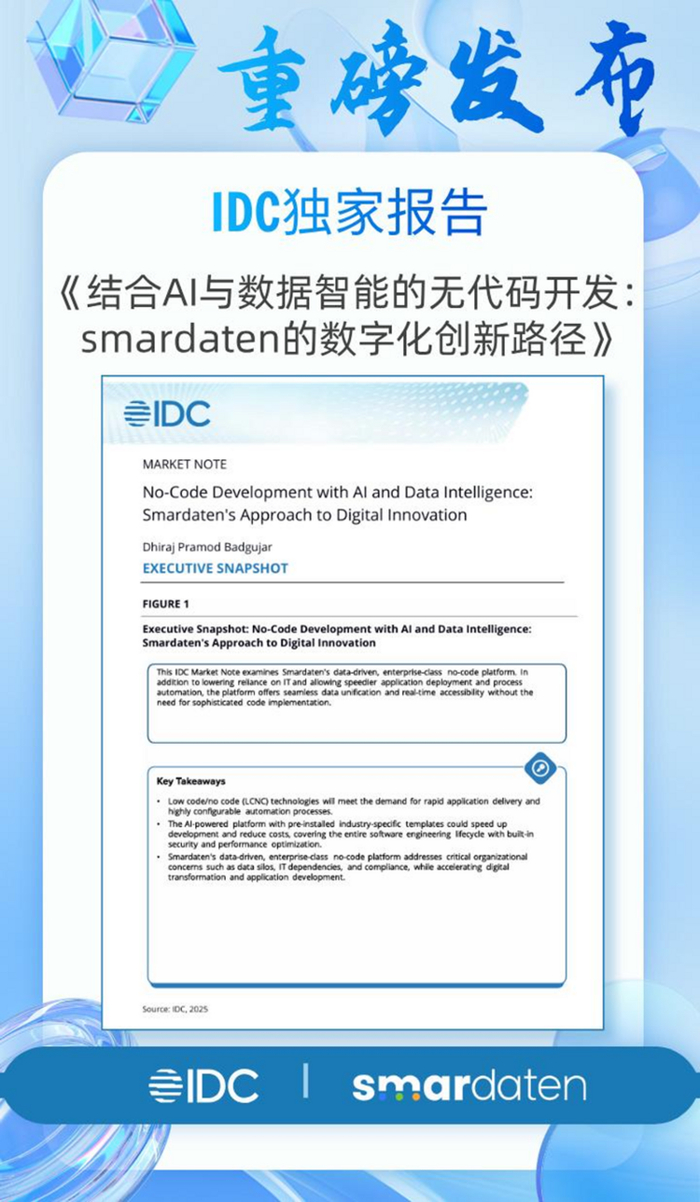 随着全球数字化转型进入深水区,smardaten展现出的“工程化落地能力+智能化创新体系”,正推动企业软件开发模式从“技术适配业务”向“技术驱动业务”的范式转变。IDC报告结论表明,这种以数据智能为基座、AI赋能为引擎的新型平台架构,有望成为企业数字化进阶的核心操作系统,每一家企业都能拥有与巨头比肩的技术敏捷性。