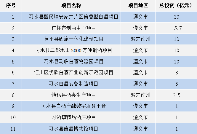 4.贵州发布11项总计约94.2亿元酒类项目