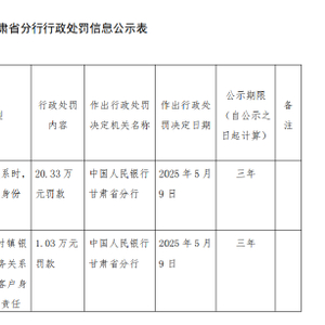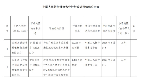 5月16日金融一线消息,据中国人民银行甘肃省分行行政处罚信息公示表显示,兰州永登新华村镇银行股份有限公司因与客户建立业务关系时,未按规定识别客户身份,被罚款20.33万元。