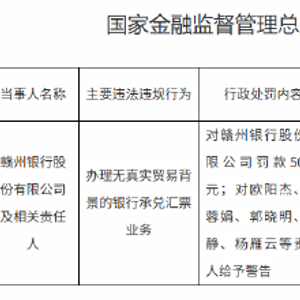 赣州银行被罚50万元:办理无真实贸易背景的银行承兑汇票业务