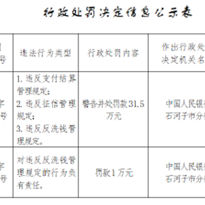 新疆石河子农村合作银行被罚31.5万元:违反支付结算管理规定 违反征信管理规定 违反反洗钱管理规定