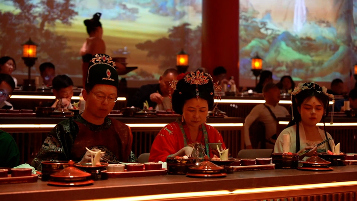 洛阳打造的"武皇盛宴"项目,将武则天故事与牡丹、龙门石窟等元素完美融合。通过全息投影、巨幅水幕等科技手段,让游客在品尝美食的同时穿越回大唐盛世。十三坊特色街区还设有"妆造司",游客可换上汉服沉浸体验,三家门店场场爆满,需提前一周预约。